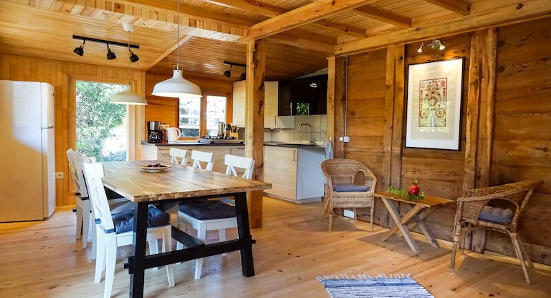 modern wooden chalet with inside and outside tables, big living room with couch, storage and a private terrace, full equipped kitchen and new, luxury bathroom.