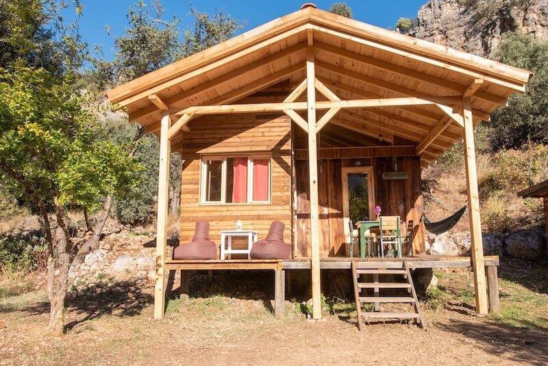 Traditional cosy cedar wood bungalows, with comfortable beds, storage and a private terrace with a table under the roof.
